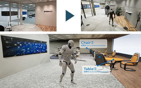 ロボットの動作環境をデジタルツインとして構築し、現実世界のロボットとデジタルツインとで相互に情報を共有することで、シームレスな動作環境を実現する。