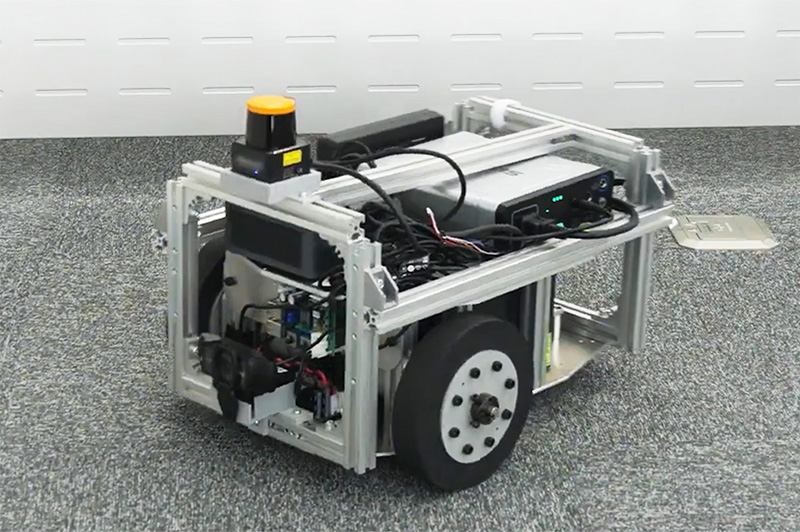 Rtinoを搭載したデモンストレーション用ロボット。移動台車での運搬から環境計測に監視、清掃まで、様々な業務を担うロボットに自律移動の機能を付与できる。